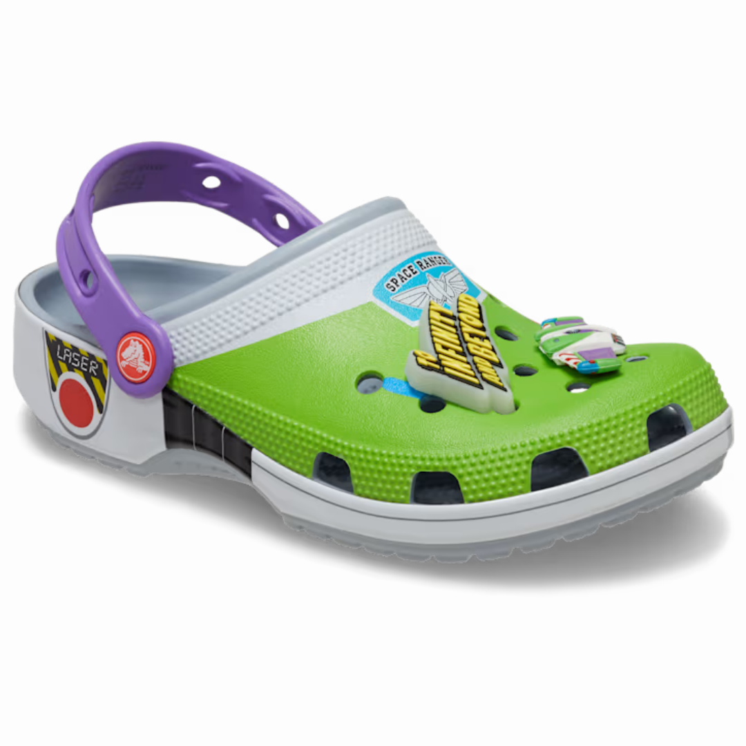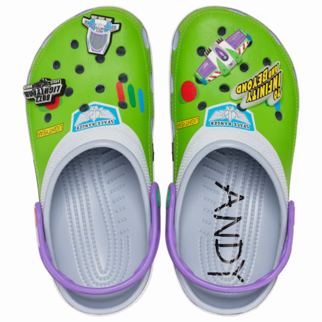 Fliege ins Unendliche und noch viel weiter mit den Crocs Classic Clog im einzigartigen Buzz Lightyear-Design. Diese Clogs kombinieren Komfort und Spaß und sind inspiriert von der beliebten Figur Buzz Lightyear aus Toy Story. Die Schuhe zeichnen sich durch ein auffälliges Design in Grün, Weiß und Lila aus, das Buzz Lightyears Raumanzug nachempfunden ist. Hergestellt aus dem bekannten leichten und strapazierfähigen Croslite™-Material, bieten diese Clogs den gewohnten Komfort und die Leichtigkeit, die du liebst. Perfekt für jeden Toy Story-Fan und ideal für den täglichen Gebrauch.